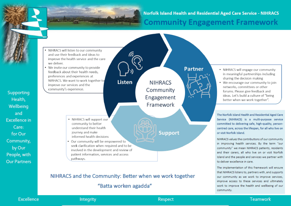 Liz Unkles, Manager of Norfolk Island Health and Residential Aged Care Service (NIHRACS), invites community members to participate in the Health Community Network. NIHRACS has established a Community Engagement Framework focused on listening to, partnering with, and supporting the community to achieve better health outcomes for all. Liz will share updates on key developments and future plans for local health services, followed by an opportunity for community members to share ideas, feedback, and suggestions in a collaborative effort to strengthen health services together.